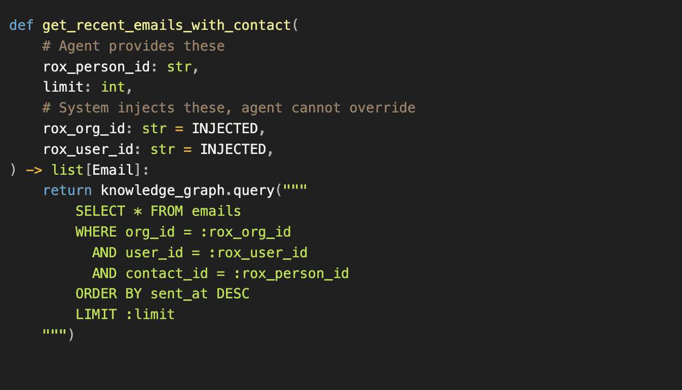 The agent sees the name and description. When it decides to call this query, it provides the parameters it controls: which contact rox_person_id) and how many emails limit). But the implementation enforces parameters the agent never touches: